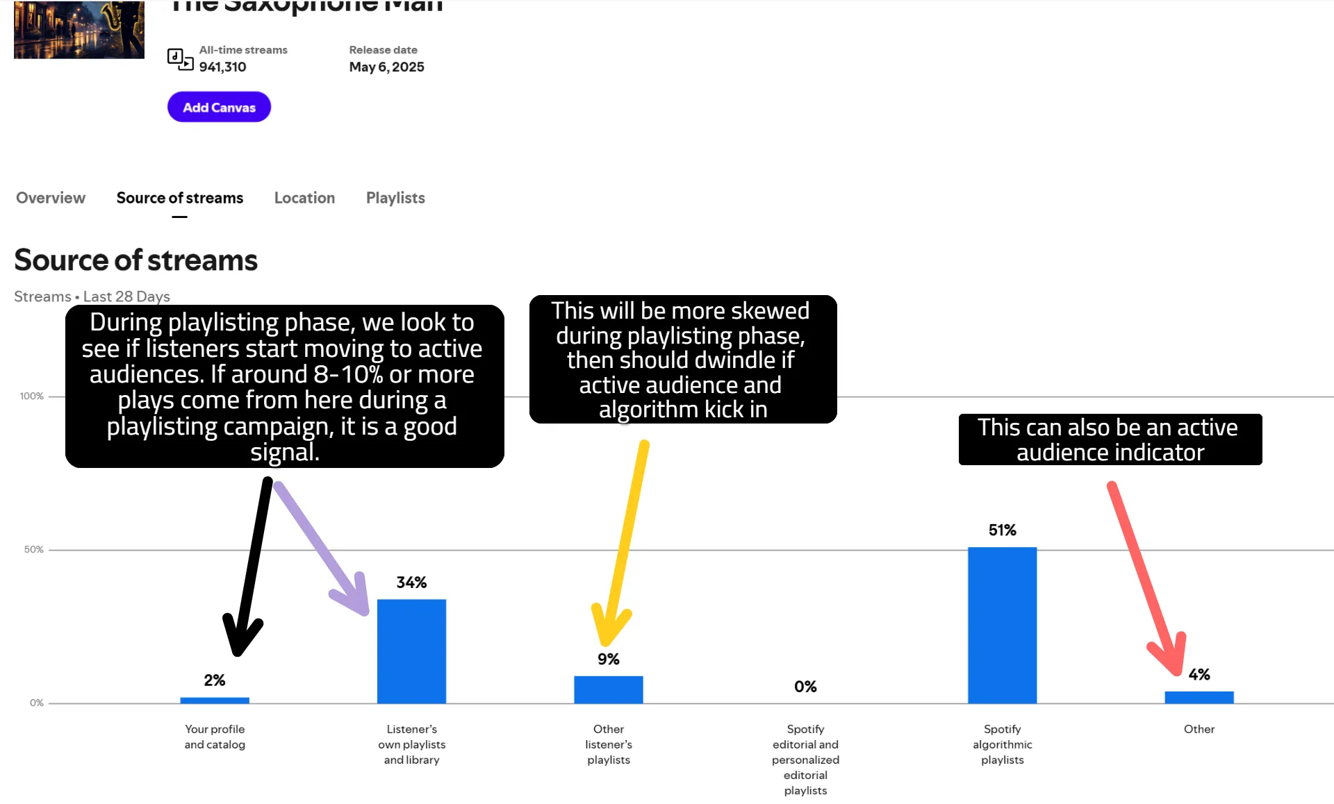 Also, if you were looking for a very specific niche promotion, YouTube is your best option. With our YouTube promotion there is the capability to target by niche genre as well as by country. For Spotify, the promotion is only done by main genre and is broader. For instance, if a song is Dreampop, it would likely get placed in playlists that feature Pop music. However, getting it into only ‘Dreampop’ lists is not likely to happen during the Spotify promotion.